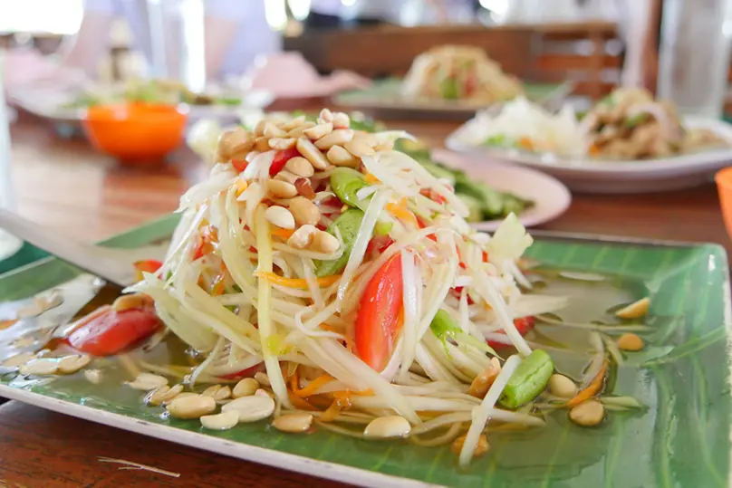 タイ東北地方の郷土料理であるイサーン料理は、その独特なスパイシーさがクセになると評判で、二次会やちょっと一杯飲みたい時のディナースポットとしてもおすすめ。深夜まで営業しているため、時間を気にせず友人とゆっくり語らうにもぴったりの場所です。