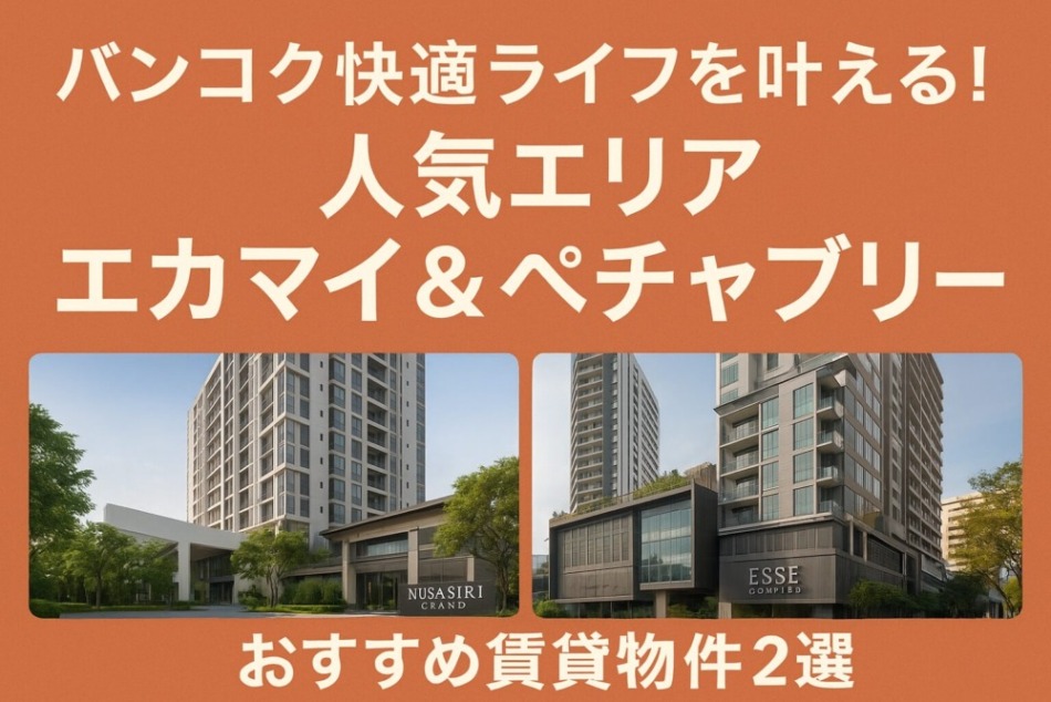 バンコク在住31年の「あぱまん情報」が、交通アクセスと生活利便性に優れた人気賃貸物件を紹介。BTSエカマイ駅直結の「Nusasiri Grand」は広々3LDKで家族に最適。MRTペチャブリー駅近の「Esse Complex」は単身者に人気の1ベッド。どちらもモール併設で暮らしやすく、日本語で無料相談可能。