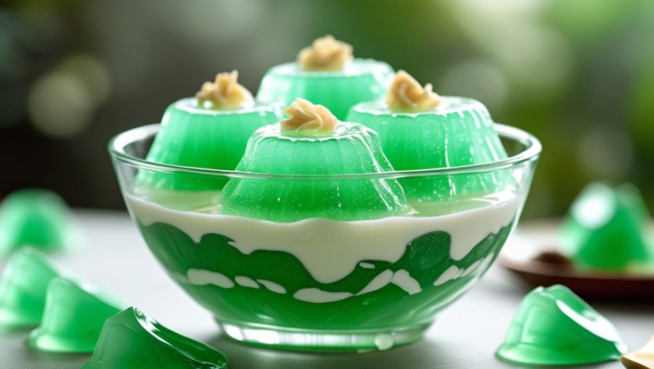 ぷるぷるの緑ゼリーにココナッツミルクがとろ〜り、クラッシュアイスでキーンと幸せ🌈