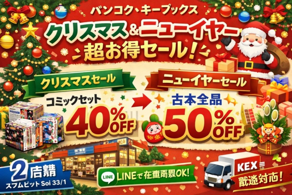 バンコク・スクムビットの日本語書店「キーブックス」では、年末年始にお得なクリスマス&ニューイヤーセールを開催。12月1日〜1月26日はコミックセットが30%オフ、1月27・28日は最大40%オフに。さらに1月30日〜2月1日は古本全品50%オフ。小説やマンガをまとめ買いする絶好のチャンス。スクムビットソイ33/1の2店舗で9〜21時営業、LINEで在庫確認も可能。