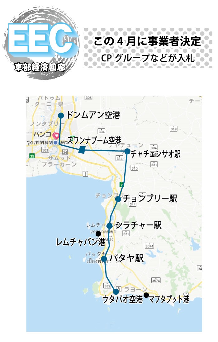 まず、ドンムアン空港、スワンナプーム空港、そしてウタパオ空港を結ぶ高速鉄道については、 CPグループによる決定がほぼ決まっているが 、CP側 も融資などで中国、そして日本の国際協力銀行 (JBIC)などと交渉中。事業費は1825億バーツで、2023年のオープンを目ざしている。