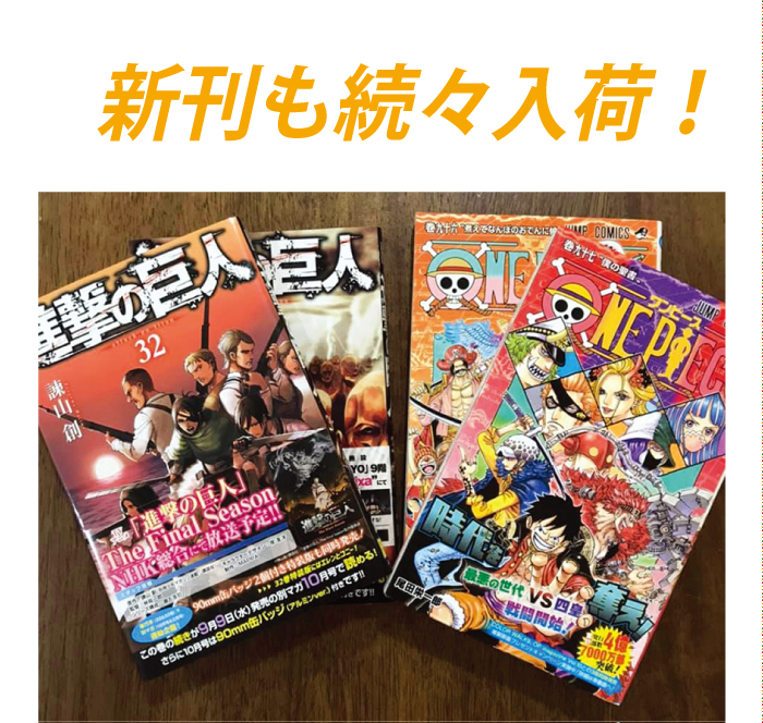 最近では、「ワンピース」の96巻と97巻、「進撃の巨人」の31巻、32巻、「ゴールデンカムイ」の21~23巻、「ダイヤのA(エース) act2」21~23巻、「ハイキュー‼」43、44巻、「宇宙兄弟」38巻、「風の大地」77巻、「ちはやふる」44巻などが入荷しています。