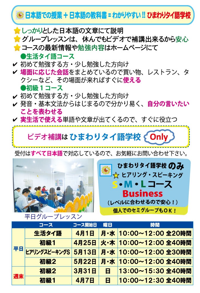 日本語での授業+日本語の教科書=わかりやすい!! ひまわりタイ語学校 NakamuraMoriyoshi 7年前 読了時間 1未満 分 2019年3月20日 タイ自由ランド掲載 -> ひまわりタイ語学校のホームページ ->タイ語学校で学ぶ!人気トップ9選! -> タイ語学校-英語学校 ->タイ語レッスンの情報 ->タイ語学校の情報 ->ひまわりタイ語学校の情報