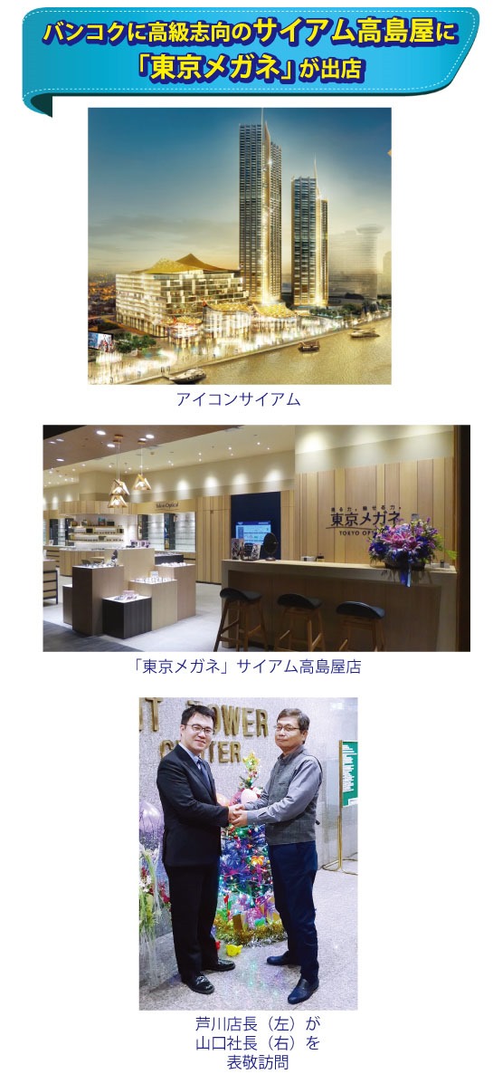 このサイアム高島屋に、このたび「東京メガネ」が出店した。バンコク・スクムビット店(フジスーパー1号店同通り)に次ぐ2号店目となる。バンコク・サイアム高島屋店の芦川豪生店長は、「当店では世界のメガネ産地として知られる福井県鯖江市のメガネと、タイの方に人気のラグジュアリーブランドを取り扱っております。日本人とタイ人スタッフによるジャパンクオリティのサービスで、快適で安心、安全なメガネをご提供いたします。また、タイで初めて、スポーツビジョンのトレーニング機器「Vトレーニング」を導入いたしました。皆様のご来店をお待ちしております。」とのことです。