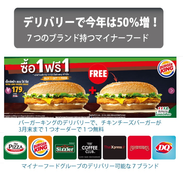タイで有名な7ブランドをレストラン展開するマイナーフードグループによると、7つのブランドを合わせたアプリケーション1112Deliveryにより、デリバリーを開始しており、今年のデリバリーでの収入は50%増を見込んでおり、45億バーツと見積もっており、昨年は30億バーツだった。