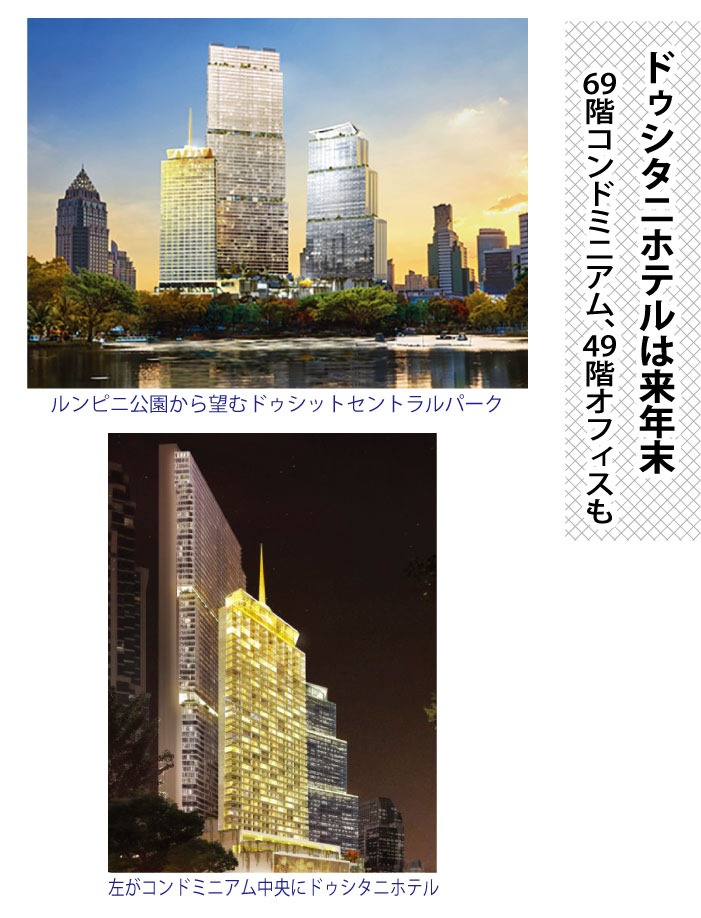 バンコクのランドマークに!とオープンしたアイコンサイアムだが、高島屋が入居し、チャオプラヤー川沿いが注目されているが、ビジネス街のシーロム、サトーンの入り口でもある場所で、再開発が始まったのは、長年、ドゥシタニホテルがあった場所で、同社と大手のセントラルパッタナー社が組んで、ドゥシットセントラルパークを建設することがこのたび発表された。