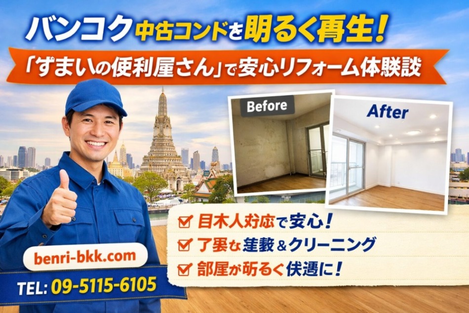 タイ好きでバンコクを訪れていた日本人が、中古コンドミニアム購入後に「すまいの便利屋さん」を利用したリフォーム体験談。壁や天井の塗装、玄関周りの修繕、照明交換まで丁寧に施工され、部屋は明るく快適な空間に生まれ変わった。日本人スタッフによる日本語対応で細かな相談ができ、居住中でも養生や清掃が行き届いていた点も高評価。バンコクで安心して住まいの改修を任せられる業者として紹介されている。
