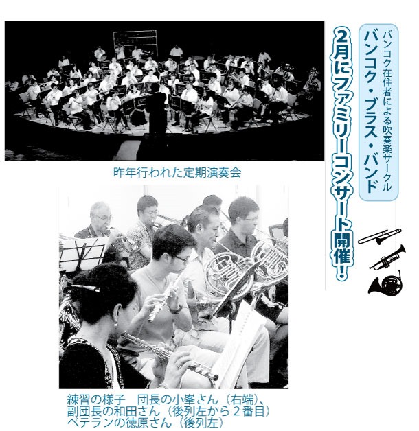 来月2月28日には、3回目となるファミリーコンサートを開催します(※下の詳細をご覧ください)。ファミリーコンサートでの演奏曲目は、アンパンマンのマーチからスターウォーズのテーマまでバラエティに富んでおり、バンコク・ブラス・バンド団長の小峯誠さんは「老若男女問わず楽しめる内容なので、ぜひお越しください」と話します。