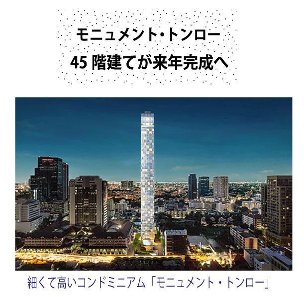 高層コンドミニアムの45階建てを現在、建設中なのが「モニュメント・トンロー」。トンロー通りのずっと奥に入って運河の手前のリバティープラザの横で、来年には完成の予定。
