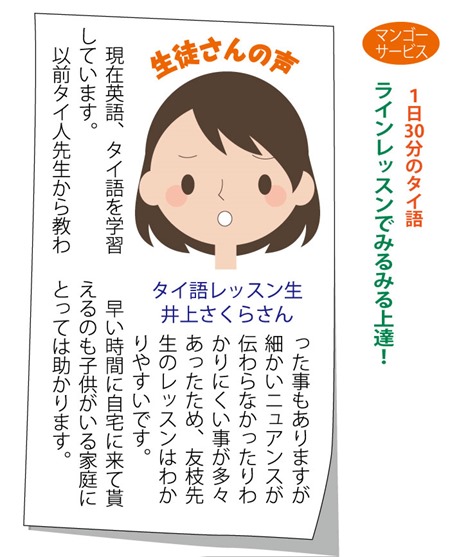 1日30分のラインレッスンで、タイ語がみるみる上達します。平日の月曜日から金曜日まで、1日30分のタイ語ラインレッスンを行います。レッスン時間は固定でも、空いている時間でも受講可能です。日常会話からタイ文字の読み書きまで、短期間で習得できます。ラインレッスンなので自宅で受講するのでなく、会社までの通勤時間やお昼休みの時間でも受講できます。詳しくはお問い合わせください。