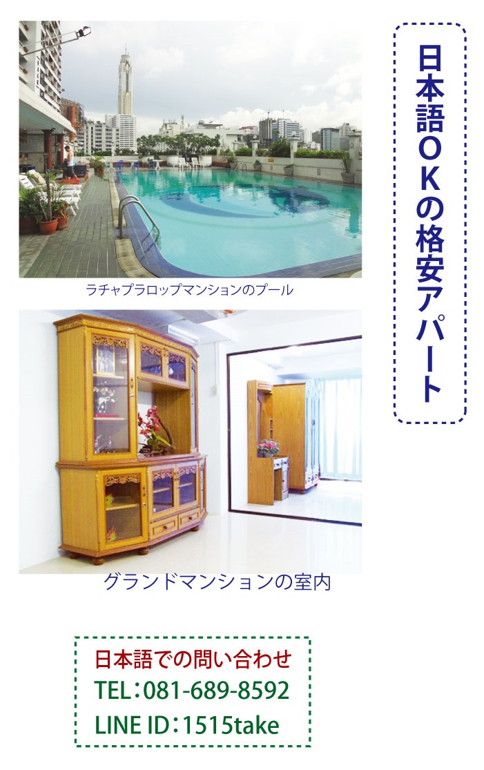 また、姉妹マンションのン「ザ・グランドマンション」はラップラオ・ソイ35にあり、一番安いスタジオタイプの部屋なら、4000バーツからとなっています。