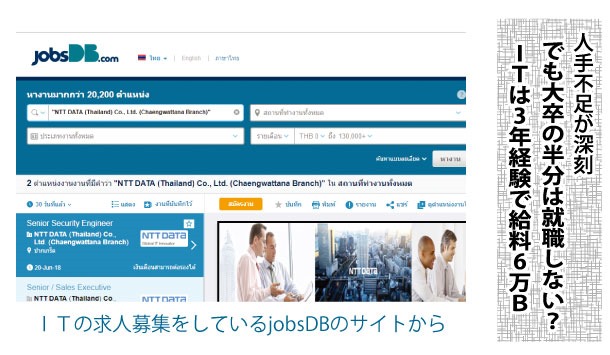 あるIT系の日本人社長によると、IT関連の人材探しは年々、難しくなっており、新卒では今は3万バーツから、というのも普通。会社でスキルを身に付ければ1年で1万バーツほどの昇給で、3年後には、6万バーツほどの人材となり、その給料を出せなければ、ライバル会社に移ってしまう、となげいている。