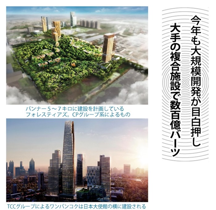 そのほか、ビジネス街シーロムの入り口にあるドゥシタニホテルの再開発で、同ホテルと大手セントラルが同敷地で367億バーツをかけてホテル、コンドミニアム、オフィス、ショッピングセンターを造るもので、今年なかばから同ホテルが取り壊され、2024年の完成を見込む。