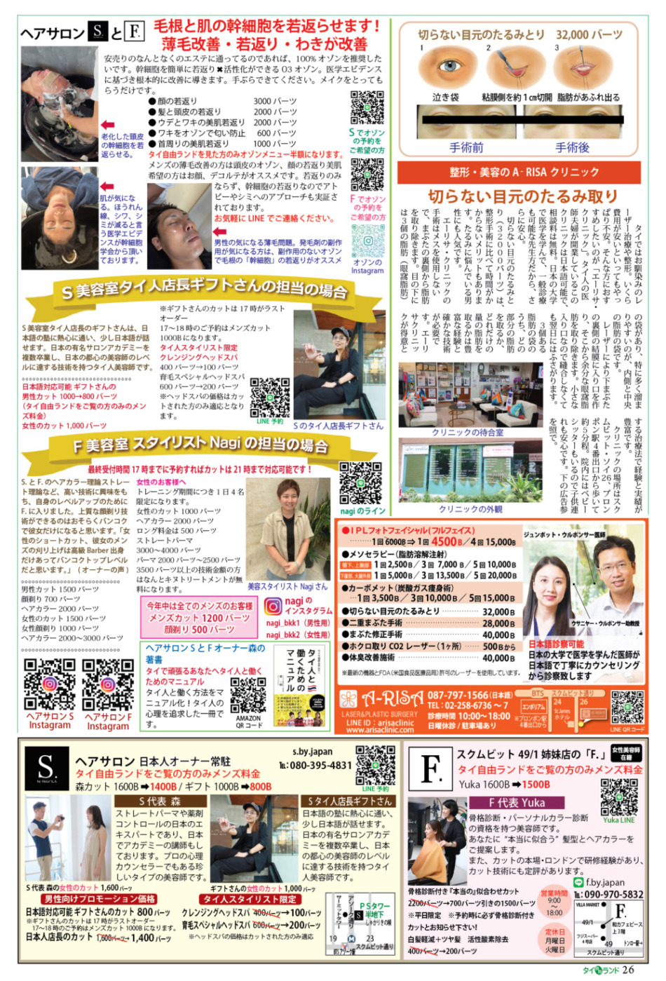 A-RISAクリニックは、BTSプロンポン駅近くにある日本語対応の日系美容クリニック。日本の大学で医学を学んだ夫婦医師が在籍し、日本語診察は無料で安心。特に人気なのが、切らない目元のたるみ取り(32,000バーツ)で、下まぶたの裏側からレーザーで余分な脂肪を除去し、ダウンタイムが短いのが特徴。男性にも自然な若返り施術として好評。二重手術や体臭改善など幅広いメニューがあり、子連れでも通いやすい環境が整っている。