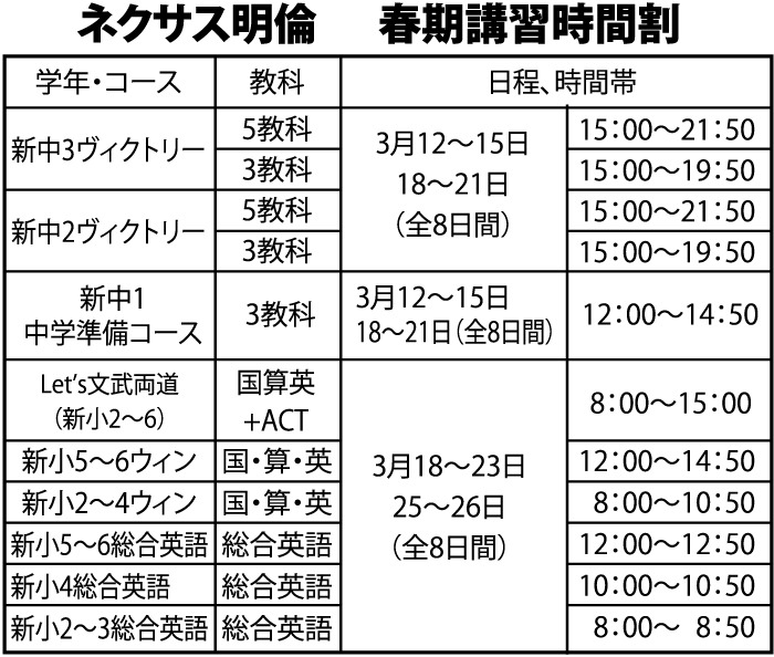 タイ・バンコク在住の日本人の子ども向け学習塾、進学塾「ネクサス明倫」の、小学生、中学生、インター生、そして子どもの英語単科コースなどのスケジュールです。スクムビット界隈は送迎(有料)なども行っています。