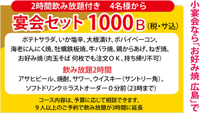 コース内容は、ポテトサラダ、いか塩辛、大根漬け、ポパイベーコン、海老にんにく焼、牡蠣鉄板焼、牛バラ焼、鶏からあげ、ねぎ焼、お好み焼(肉玉そば、何枚でもOK、持ち帰り不可)となっています。飲み放題はビール、焼酎、サワー、ウイスキー(サントリー角)、ソフトドリンクです。
