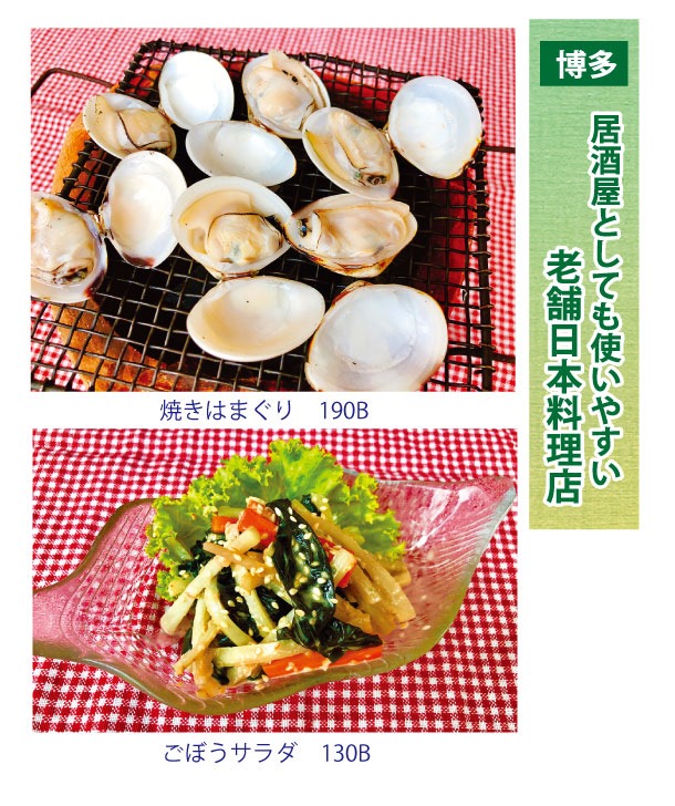 博多5月のお薦めは、焼きはまぐり(190B)、ごぼうサラダ(130B)です。ぜひお試しください。