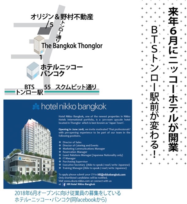 BTSトンロー駅周辺はまだ古い建物が残っているが、歩いて3分ほどのグランドタワーインの跡地は、来年6月には20階建てのホテル・ニッコー・バンコクがオープンする予定でフェイスブックなどではそれに向けて従業員などの募集も進んでいる。