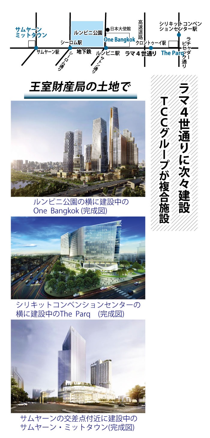 チャーンビールやエカマイ・ゲートウェイのオーナーでもあるチャルンシリワッタナパクディー氏のTCCグループは、ラマ4世通り周辺での複合開発に力を入れており、先のThe Parq、そしてOne Bangkok、さらには地下鉄サムヤーン駅前には13ライの敷地でサムヤーンミットタウンを建設中で、こちらも複合施設となり、グレードAの31階建てオフィス、33階のホテル、コンドミニアム、6階建ての商業センターを現在、建設しており、2019年末オープンを目ざしている。以前のサムヤーン市場跡地の再開発となる。
