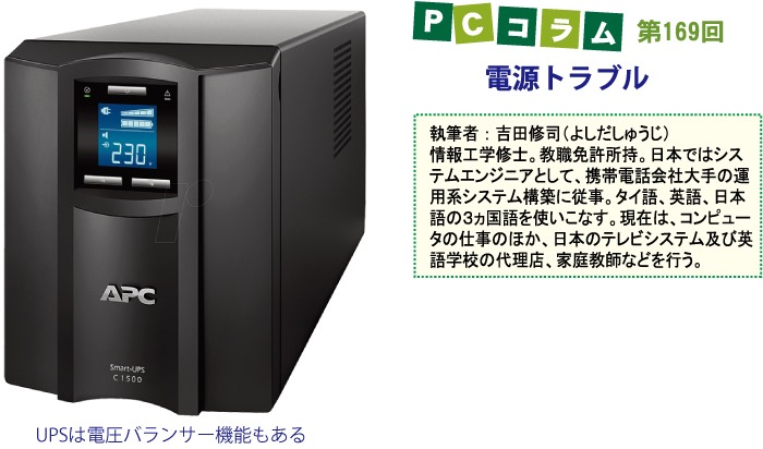また、コンピュータなどの精密機械をお使いでしたら、無停電装置(UPS)をつけることによって電圧が安定します。無停電装置は、電圧バランサーとしての機能も備えているからです。