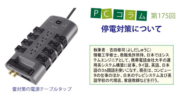 また、雷対策には「Surge Protection」と書かれたもの、過電流対策には、「Overload Protection」と書かれたテーブルタップを購入することをおすすめします。