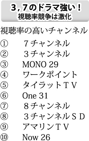 タイでのテレビ放送事業については競争が激しくなっており、ニールセン社の調査では、視聴率で圧倒的にナンバー1なのが、7チャンネルで、プライムタイムのドラマが支持を得ており、続いて3チャンネルが続き、昔からのこの2つのチャンネルのドラマはゆるぎなく、特に地方での支持も見逃せない。
