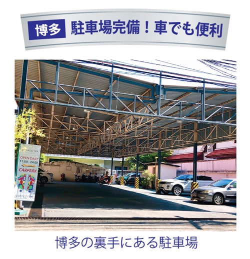 博多の裏側には20台程度駐車できるパーキングがございます。フォーウィングズホテルとの間の道を入ったところです。もしも、パーキングが満車の場合は、隣のフォーウィングズホテルに駐車できます。博多で駐車無料のスタンプを差し上げます。