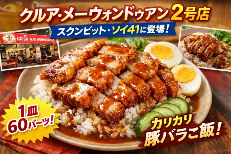 スクムビット・ソイ41に、人気タイ料理店「クルア・メーウォンドゥアン」の2号店がオープン。看板メニューはカーオ・ムーグローブ(クリスピーポークご飯)で、肉厚でカリッとした豚バラに甘めのタレがご飯によく合う。フードコートより量が多く、1皿約60バーツとコスパ抜群。辛さ控えめで日本人にも食べやすく、ランチやディナーに気軽に立ち寄れる一軒。