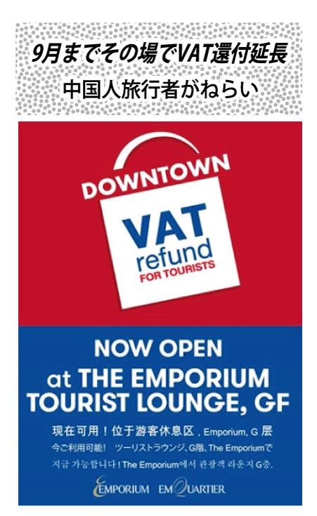 これは外国人旅行者が、バンコク都内の主要なショッピングセンターで商品を買う際、その場で手続きをして消費税分のVAT7%を還付してもらうというもの。