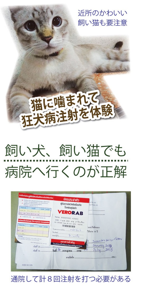 タイには犬や猫がそこらじゅうにいますが、噛まれたり、引っかかれたりした場合、どうすればいいのでしょう?インターネットで調べると傷口を石鹸で洗って消毒して、すぐに病院に行って注射を受けることとあります。
