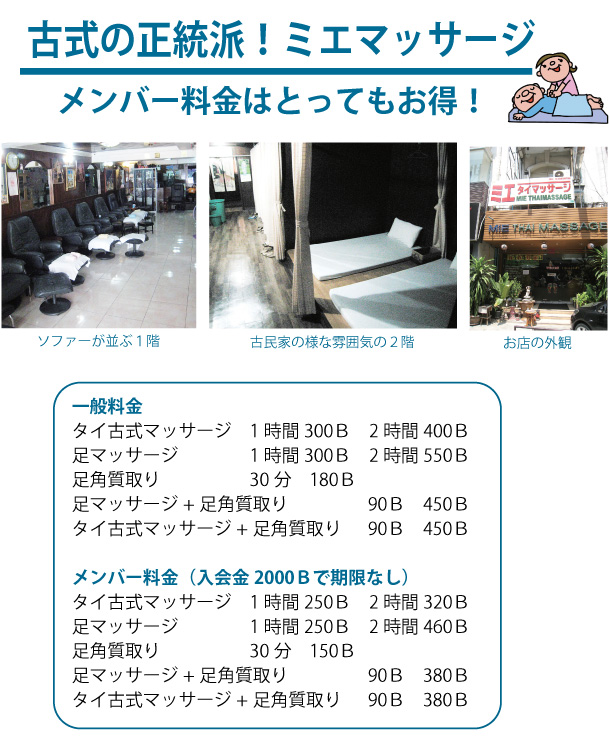 「ミエタイマッサージ」は、タイ政府指定学校を卒業したプロのマッサージ師による施術が受けられます。タイ古式マッサージ2時間500バーツ、足マッサージ1時間300バーツ、足裏角質取り30分200バー ...