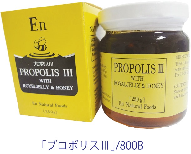 健康管理や美容におすすめなのがEnブランドの「プロポリスⅢ」。250㌘瓶の中には、はちみつ(85%)、ロイヤルゼリー(11%)、プロポリス(9㏄)が含まれており、1日ティースプーンで1~3杯ほど、牛乳やジュースに混ぜて飲むだけ。