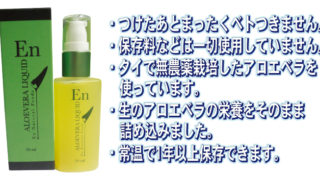 チェンマイで無農薬栽培されたアロエベラを凝縮したのが、エノタイ製の「アロエベラリキッド」。万能のスキンローションで、無着色、無香料、無添加。女性には安心して化粧水としても使っていただけ、ビタミン、ミネラル、アミノ酸などの有効成分が含ま ...