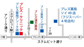 日本人常駐のブレズ薬局は、現在バンコク市内で2店舗展開しています。BTSと地下鉄側のアソーク店と、在住者の御用達フジスーパー4号店の中にソイ49店があり、どちらも日本語でお買い物できます。