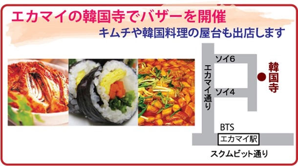 毎年恒例のチャリティーバザーを開催いたします。韓国から持ってきたキムチ、新鮮なイチゴや野菜などを販売。各種屋台も出店します。