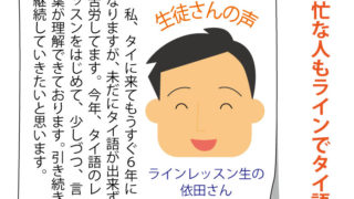 「マンゴーサービス」ではラインによるタイ語レッスンを行っています。一度はタイ語学習にトライして途中で挫折した方も少なくありません。挫折された理由も様々だと思いますが、学校に通うのが大変だったり ...