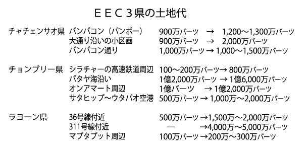 タイ政府のEECの政策により、タイ東部3県の土地代は上がり続けており、タイローカル紙の調べによると、新都市が建設されるといわれるチャチェンサオ県では、トヨタ工場のあるバンポーなどで以前の1ライ900万バーツが、1200~1300万バーツに高騰している。