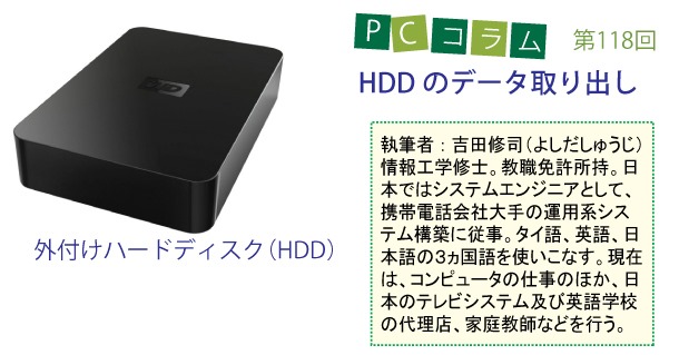 こんにちは。PCサポートタイランドの吉田です。コラム第118回のテーマは、「HDDのデータ取り出し」についてです。