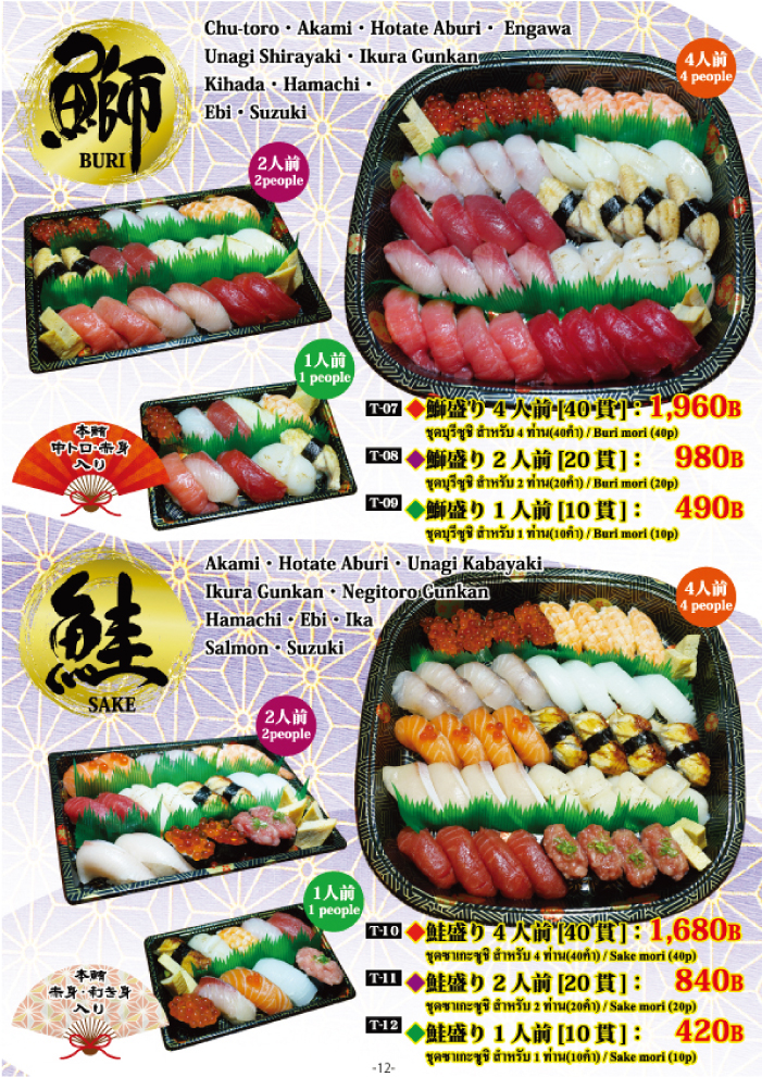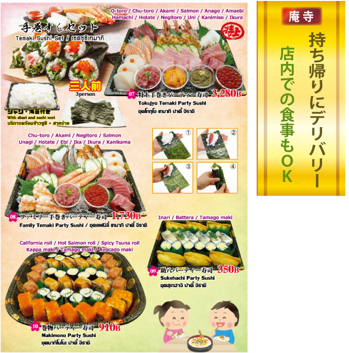 一方、持ち帰りやデリバリーも受け付けています。豪華な手巻き寿司のセットはシャリと海苔が付いていて、自宅で家族で楽しんでいただけます。いなり、バッテラ、たまご寿司のセットは350バーツでお得。