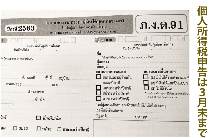 これは日本人についても同じで、タイで納税番号を取って働いている人は、ポーオードー91の申告が必要。2020年はコロナ禍によるショッピング控除などがあったので、2020年分全体の収入からさらに控除分を差し引けるので、計算し直す必要がある人もいるでしょう。
