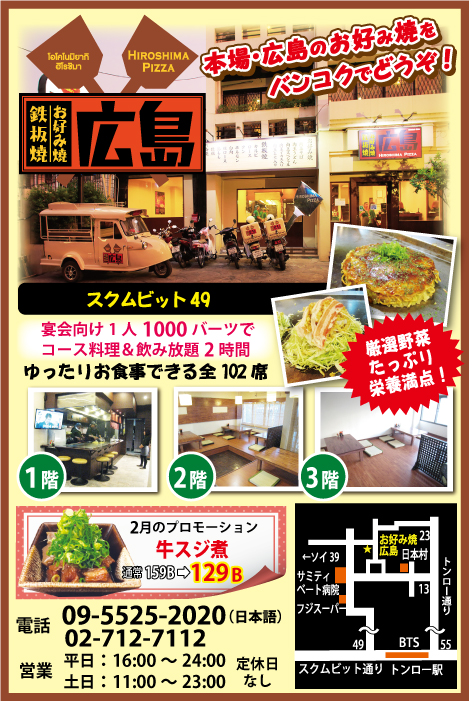 お好み焼 広島 のデリバリー NakamuraMoriyoshi 5年前 読了時間 2 分お好み焼 広島の一軒家の店構え、1~3階が客席 本場・広島の味をバンコクで提供している「お好み焼 広島」。 お好み焼はトッピングが豊富で、チーズ、ねぎ、もち、イカ天など組み合わせたできます。 肉をガッツリ食べたい時は肉ダブルで、野菜たっぷりでヘルシーに食べたい時は野菜ダブルなど、具の増量もできます。 テイクアウトやデリバリーにも対応しており、自宅でお好み焼きを食べたい時にご利用下さい。 焼き上がりまで20~30分ほどかかります。エリア内の配達料は50バーツで別途VATもいただきます。下のメニューをご覧ください。 店内は土日曜は昼11時から通しで営業中で、家族での食事にもどうぞ。2階は座敷席があり、のんびりくつろげます。3階の個室は9名~15人で貸切可能。 時短営業が続く中でもがんばって営業中の 「お好み焼き 広島」は、スクムビット・ソイ49の閑静な住宅街にあります。 サミティベート病院を過ぎて、最初の交差点を右に曲がってしばらく行ったところにあり、一軒家で1~2階に客席がある。 この店のお勧めは何といっても「肉玉そば」。いわゆる豚玉とそばのミックスで、219バーツで提供しています。そばのかわりにうどんにもできるので、オーダーの時に伝えて下さい。 テーブルにはマヨネーズやオタフクソースがあるので、お好みの味でどうぞ。 それ以外にも、各種鉄板焼き、ホルモン焼き、酒の肴などが揃っているので、平日の夕方はビジネスマンのグループ、そして週末は日本人家族にピッタリ。 一方、ステイホームの人向けにはデリバリーも独自で行っており、日本語で電話で注文下さい。メニューは上のQRコードを参照してください。とってもリーズナブルです。 下の広告も参照で。 2021年2月5日 タイ自由ランド掲載 Google Map 関連リンク ->テイクアウト、デリバリーできる店! 更新2021/2/5-> お好み焼 広島のページ -> タイの日本料理店 -> 鉄板焼きがいただける店 -> 宴会によい店 -> 居酒屋 -> 厳選 ! 鉄板焼きがメインの店 -> 厳選 ! 宴会、パーティーで使える店 -> 宴会、パーティー向けの最強トップ20選! -> 鉄板焼きが自慢の店一覧 -> トンロー、エカマイ周辺の日本料理一覧 -> 宴会やパーティーのできる日本料理店一覧 >お好み焼きの情報->お好み焼広島の情報 ->鉄板焼きの情報 → 宅配、デリバリー、配達の全一覧 → デリバリー、宅配のお弁当トップ8選! → 厳選 ! お弁当のデリバリー、宅配、配達 そのほかのデリバリー foodpanda、Grab food LineMan GET!