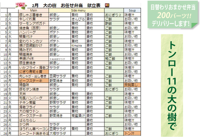 2月の日替わりお任せ弁当 献立表修正しました。 10枚券購入で 200baht/1食 22枚券購入で 182baht/1食 デリバリー可能です ご注文は以下のLINEへご登録下さいませ https://lin.ee/FIPzAH0 Dainoki大の樹さんの投稿 2021年1月15日金曜日