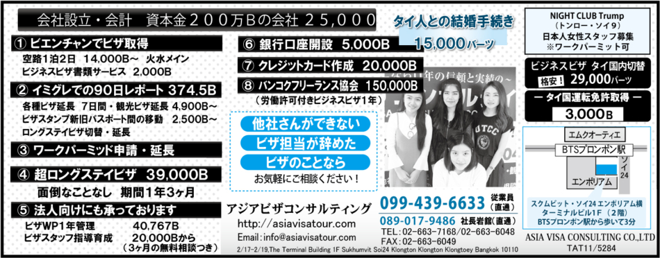 タイ人との結婚手続きやタイの運転免許証取得についても経験豊富なので、ビザからビザ関連のあらゆることを解決してくれます。