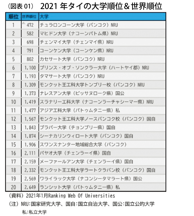 ①タイの東大と言われるチュラロンコン大学 ②タイ初の医療学校として設立されたマヒドン大学 ③法律政治分野が特に有名なタマサート大学 ④タイ初の農業大学のカセサート大学 ⑤タイ初の地方大学のチェンマイ大学がある。