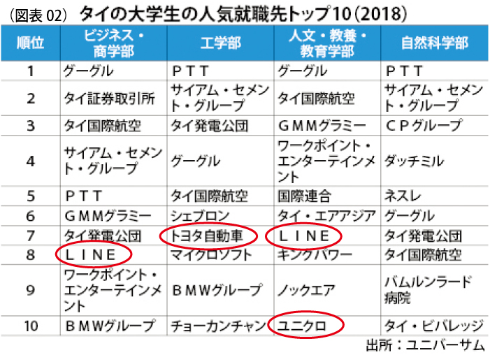 企業価値調査を手掛けるスェーデンのコンサルティング会社の調査によると、タイでは、米国グーグル社と国営石油PTTが人気だ。日本企業では、工学部の7位にトヨタ自動車、文科系の7位等にLINE、10位にユニクロが入っている(図表02)。