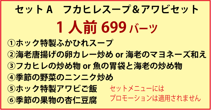 現在プロモーションでフカヒレ、アワビなどの高級食材を惜しみなく使ったセットメニューが699バーツで頂けます。