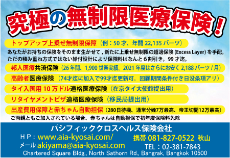 また、タイ国内で切り替えたOビザなので保険など関係ない、必要ない、などと放置していると、突然の移民法改定時に適格保険の新規加入できない年齢になっていてビザ更新不可となる例もあります。