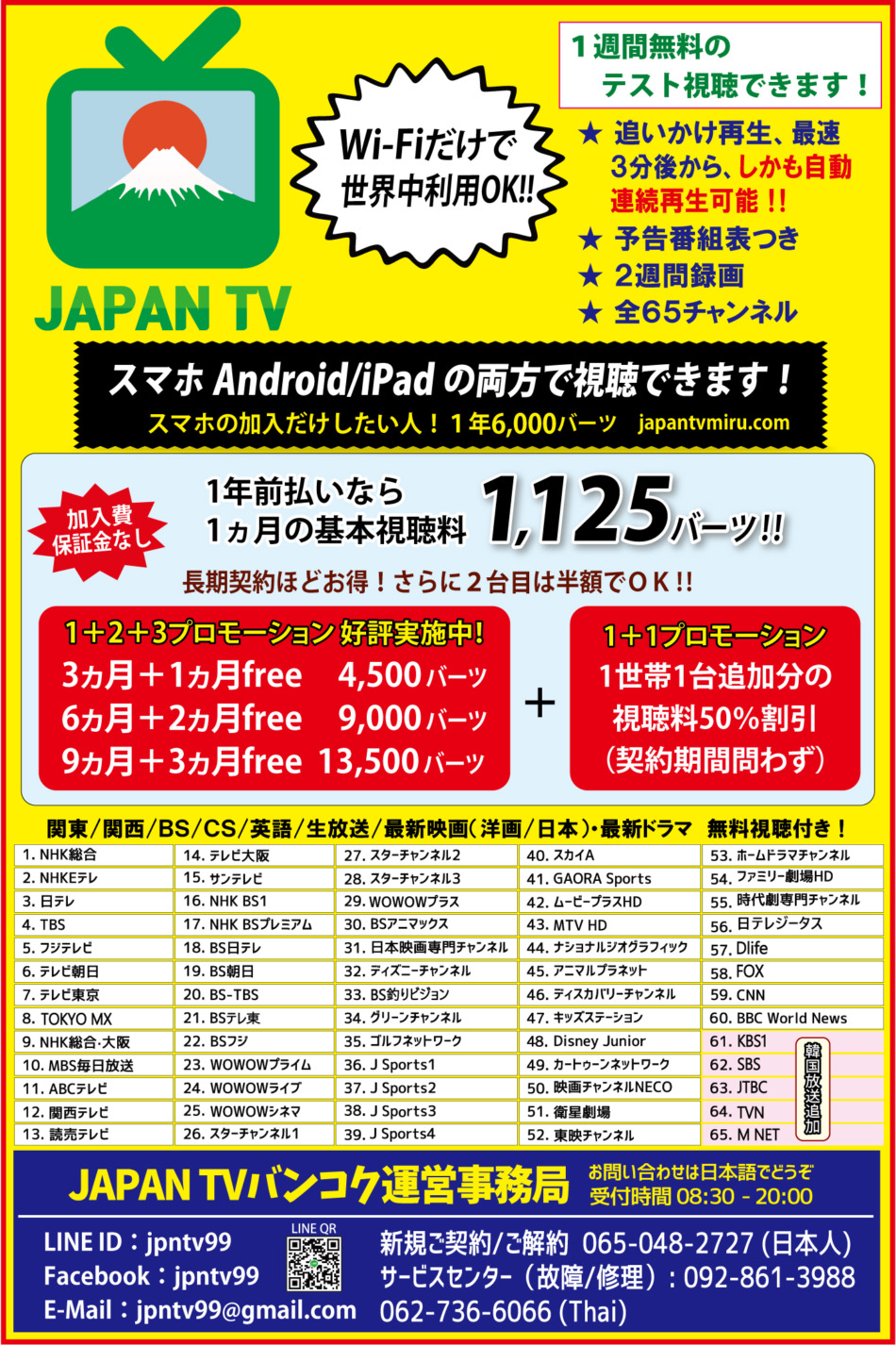 また、スマホやパソコンでも見られるので、旅行先でも日本のテレビを見られます。こちらは同社が提供するコードを入れれば、すぐに使えるので便利!ウェブ版だけ加入したい!と場合は1年6000バーツとなっています。訪問無しのオンラインのみで申込みができます。
