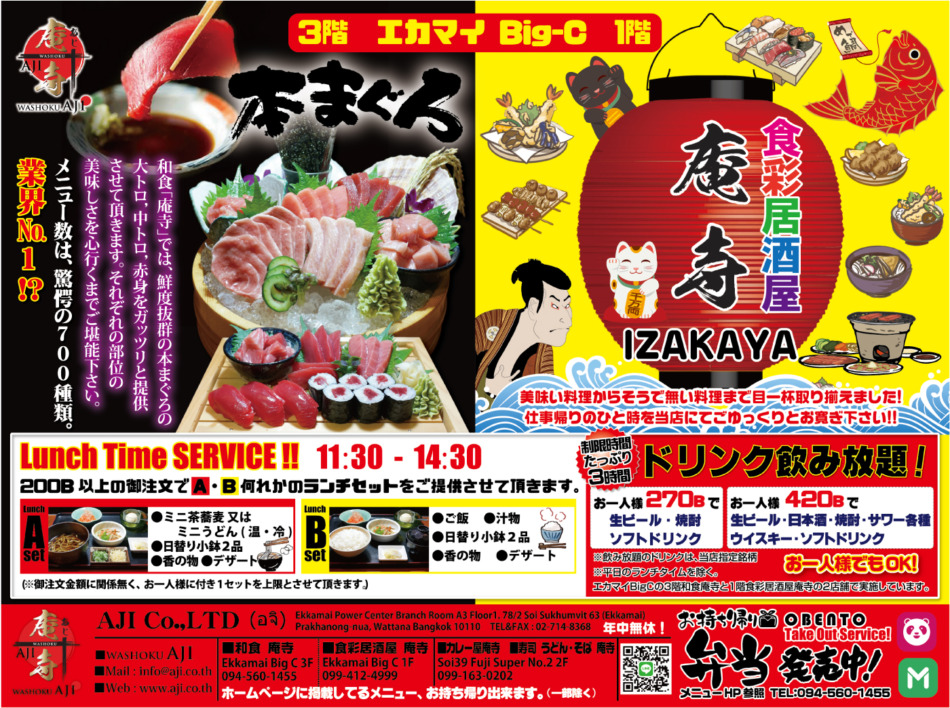 日本直送の素材も豊富に揃ったエカマイ・ビッグC3階の「和食庵寺」では、ランチタイムにお得なセットがあります。200バーツ以上の一品注文で、AかBセット(広告参照→)が無料で付いてきて、豪華なランチに早変わり!
