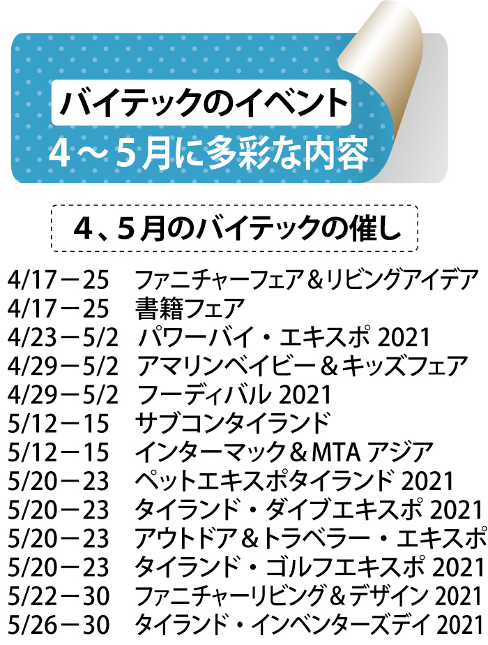 さらに4月23日~5月2日まではパワーバイ・エキスポ、そして4月29日~5月2日までがアマリンベイビー&キッズフェアとフード関連のフェアが開かれ(本紙32面参照)、続いての5月にはさらに「サブコンタイランド」「 インターマック&MTAアジア」など、建築、製造、機械、「ペットエキスポ」「ダイブエキスポ」「アウトドアトラベラーエキスポ」「タイランドゴルフエキスポ」「ファニチャーリビング&デザイン」「タイランドインベンターズデイ」などとても多彩で、ようやくチョイスできる楽しみが増えてきた感じです。